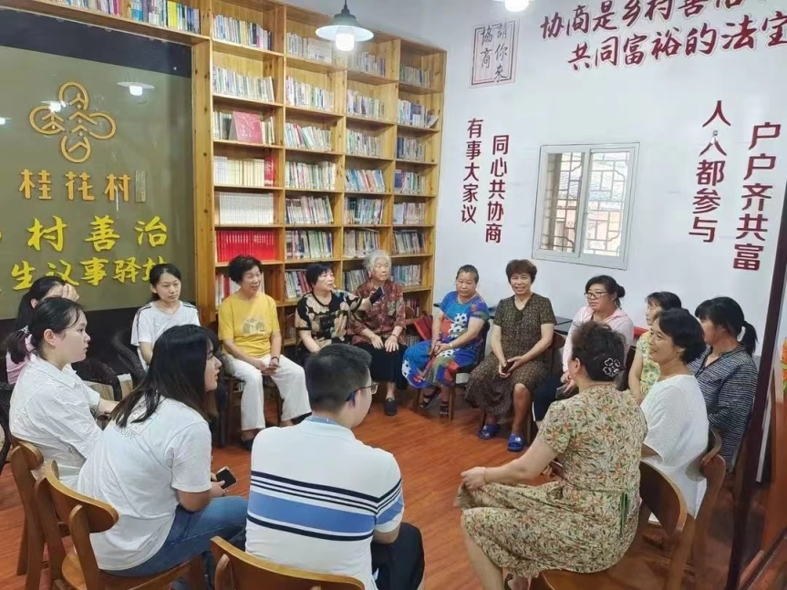 在寿昌镇桂花村,我们走进了十多户村民家中,通过非参与式观察、集体访谈的方式了解村风村情,勾勒基层治理工作的图景;在老年食堂和助餐点,了解了食堂运作情况、服务理念和工作制度,感受到桂花村尊老敬老爱老的德文化;走在村里,整洁的环境、便利的服务设施以及村委工作宣传板无不呈现着桂花村的特色:没有一个保洁员,人人都是保洁员人和为桂村景如花片组微治理在党群服务中心,我们更全面和深刻地感受到桂花嫂们在美丽庭院、垃圾分类、乡村治理、产业发展等工作中的重要作用。