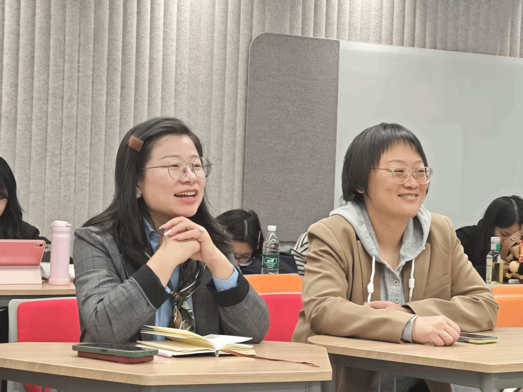 分享间隙的“你划我猜”互动环节让现场氛围愈发热烈。主持人给出“缠足、娘子军、妇联、三八线”等与榜样事迹、妇女发展相关的关键词,同学们两人一组默契配合,或通过生动手势演绎,或用简洁语言传递,现场笑声与掌声此起彼伏。这种趣味形式不仅加深了大家对榜样事迹和理论概念的记忆,更让马克思主义妇女观从抽象理论变得鲜活可感。