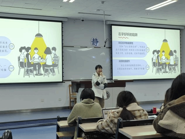 紧接着杨静姝老师聚焦岗位选择,结合实际案例提醒考生警惕岗位名称陷阱,强调“选岗适配大于盲目追热门”,并分享如何通过各省市人力资源和社会保障局官网及时高效发掘岗位招聘需求、深挖岗位职责与发展空间等;同时她建议同学们充分利用在校资源提前做好职业规划,如预约“小薄荷工作室”的就业指导咨询,积极参加“全国大学生职业规划大赛”明确未来发展道路等,不断提升个人综合能力。