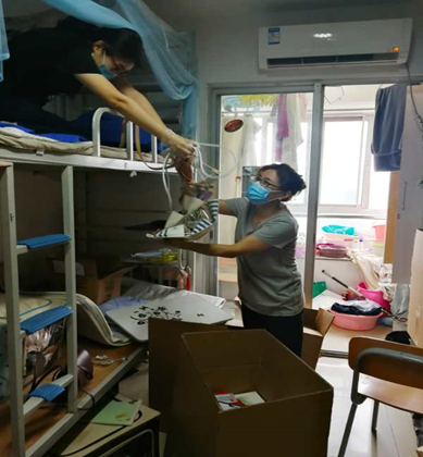 在这里还要特别提及和感谢的是,法学院5名在京学生,她们利用空闲时间来到学校,不仅收拾了自己的行李,还帮助其他同学打包行李,减轻了老师们的负担。