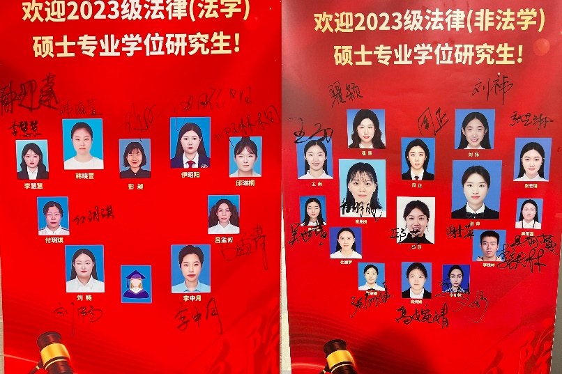 学院为新生准备了贴心和特色的欢迎活动。首先是拍摄新生报到时的视频,记录大家来到法学院的第一面。其次是邀请每位新生在印有自己照片的易拉宝上签字,书写来到法学院的第一笔。