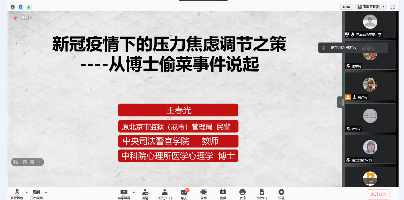 2021年11月28日下午3:00,中央司法警官学院矫正教育系教师、中央司法警官学院戒毒康复研究中心研究院王春光应邀为法学院开展题为“新冠疫情下的压力焦虑调节之策---从博士偷菜事件说起”线上讲座。法学院全体学生以及部分学院老师参加本次讲座,讲座由法学院党总支书记、副院长邢红枚主持。