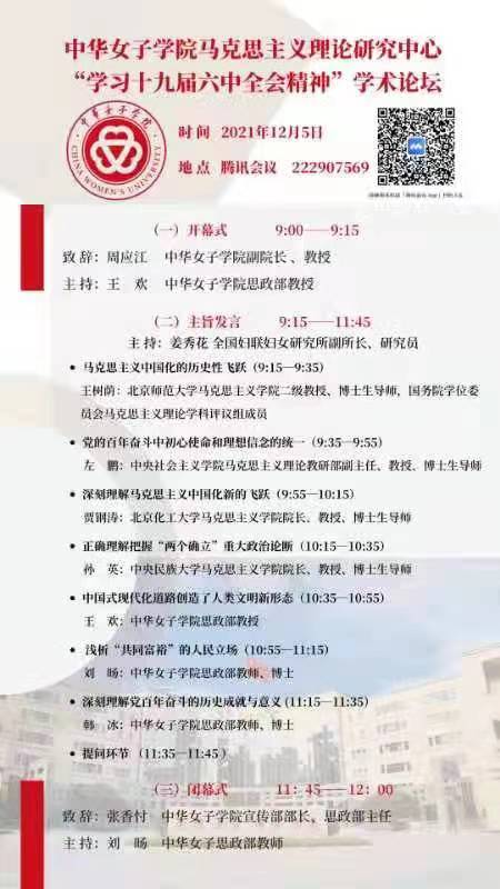 12月5日,法学院教工党支部组织党日活动,支部全体党员在线上参加了我院马克思主义理论研究中心举办的“学习十九届六中全会精神”学术论坛。论坛由中华女子学院副校长周应江教授致开幕词。会上,北京师范大学王树荫教授梳理了马克思主义中国化的历史性飞跃;中央社会主义学院左鹏教授阐释了党的百年奋斗中初心使命与理想信念的统一;北京化工大学贾钢涛教授分析了马克思主义中国化新的飞跃的重要意义;中央民族大学孙英教授阐释了如何正确理解“两个确立”重大政治论断;法学院教工党支部、思政部王欢教授阐释了中国式现代化道路如何创造了人类文明的新形态;思政部刘旸博士解读了“共同富裕”的人民立场;韩冰博士阐释了党百年奋斗的历史成就与意义。