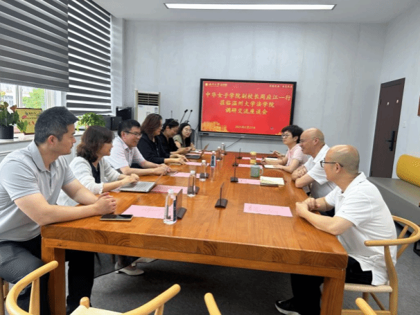 2025年6月23日下午,中华女子学院副校长周应江一行赴温州大学法学院开展法律硕士授权点专项合格评估及学科建设调研交流。温州大学法学院院长王宗正、副院长周一颜、法学专业负责人肖磊及研培科科长胡亚玲参加座谈会。双方围绕法律硕士点专项合格评估工作展开深入交流。王宗正院长对周校长一行的到来表示欢迎,并详细介绍了温州大学法学院的建设历程、师资队伍、学科特色等基本情况。副院长周一颜则围绕温州大学法学院法律硕士点建设及人才培养等方面进行了详细介绍。法学专业负责人从温大法学院迎评策略等方面详细介绍了法律硕士点专项合格评估工作的开展、实施及重难点突破等。随后,双方围绕法律硕士授权点专项合格评估师资队伍、科研支撑及实践基地建设等多方面进行了深入细致的交流。中华女子学院副校长周应江表示非常感谢温州大学法学院为女院法律硕士学位授权点迎评工作提供宝贵的经验,并介绍了中华女子学院的基本情况,希望双方能进一步加强联系,拓宽合作领域。