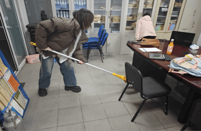 同学们满怀热忱,干劲十足。她们手持扫帚、抹布等各种清洁工具,仔细地清除会议室内的灰尘、污垢和垃圾,对会议室的椅子、桌子进行了仔细擦拭,确保每处卫生死角都能得到彻底的清洁。