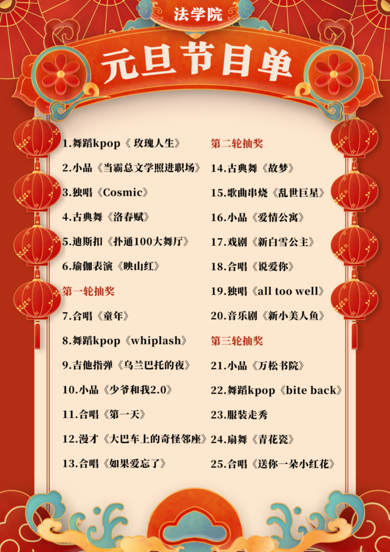 岁末将至,敬颂冬绥,共祈佳年。2024年12月17日下午3点,法学院2025年元旦文艺联欢会在礼堂拉开帷幕,法学院师生欢聚一堂,携手迎接新年的到来。本次联欢会共计25个节目,涉及舞蹈、合唱、乐器弹奏、漫才、小品、戏剧、走秀等多种形式。在舞台上,表演者们大放异彩、各显千秋,为观众带来了一场难忘的视听盛宴。