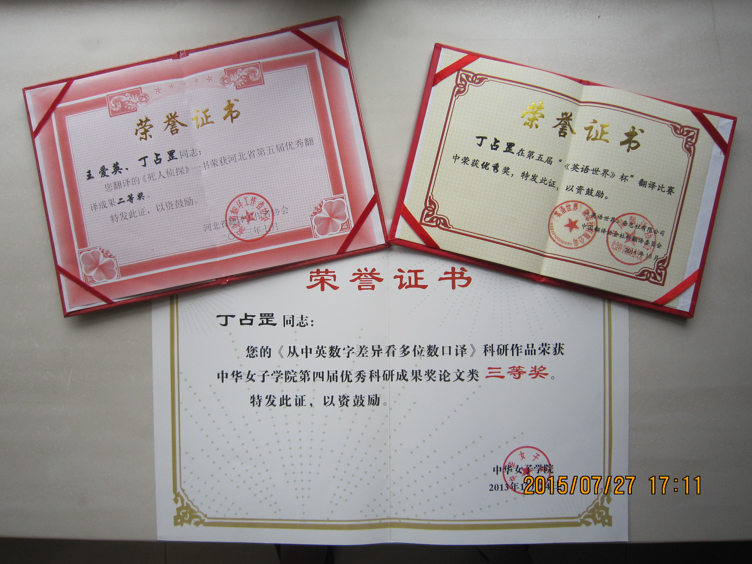 2)2013年12月,论文“从中英数字差异看多位数口译”(丁占罡撰)获中华女子学院第四届优秀科研成果三等奖。