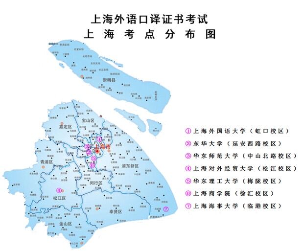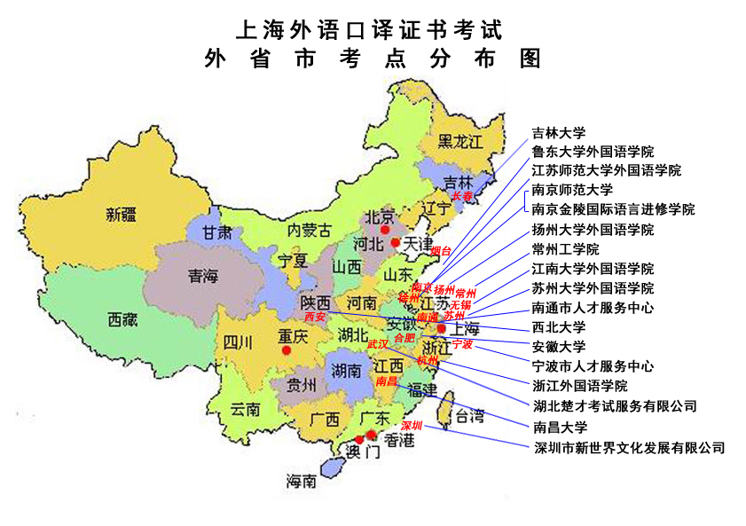 上海外语口译证书考试项目从长三角地区合作起步,覆盖10个省市17个大中城市,有21所本科院校参与,目前共设有23个考点(详见附图)。