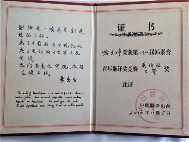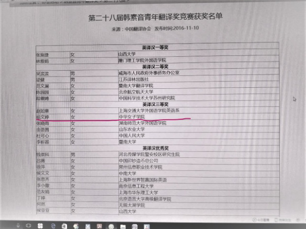 中华女子学院学子喜获“第28届韩素音青年翻译奖竞赛英译汉三等奖”