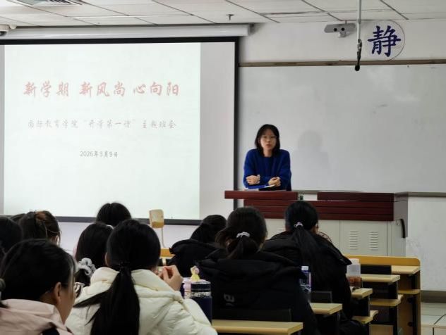 为明确新学期学习目标,凝聚专业发展共识,2026年3月9日,国际教育学院“开学第一课”主题班会在教图楼206教室举行。国际教育学院党总支书记、院长、班主任、辅导员和全体学生参加。
