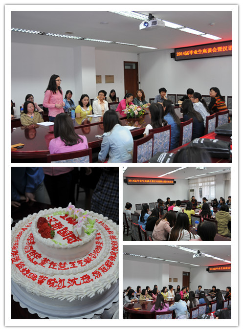 2014年5月7日,汉语国际教育系在主楼二层会议室召开了2014届毕业生座谈会暨海外志愿者欢送大会,会议由系总支书记陈丽君主持,招生就业处副处长周志慧,教务处处长助理张小红,学生处资助中心主任吴唐燕参加了会议。
