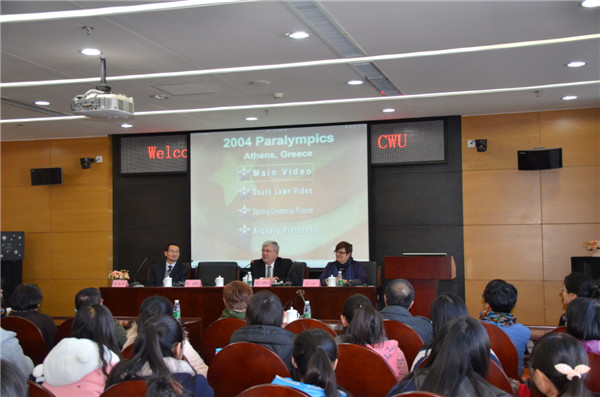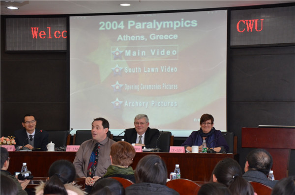 陪同厄尔波特校长来校访问的还有圣克劳德州立大学教育学院环球教育项目主任庄凯西、社区心理学艾米科诺夫教授、社会学与人类学系主任左际平教授和研究生艾伦克洛斯。厄尔波特校长为我校社会学专业学生做了“高等教育面临的挑战和变化”的演讲,并介绍了圣克劳德州立大学情况;艾伦克洛斯通过自己作为残疾人的亲身经历介绍传递了当代大学生自强不息、勇于挑战自我的精神。