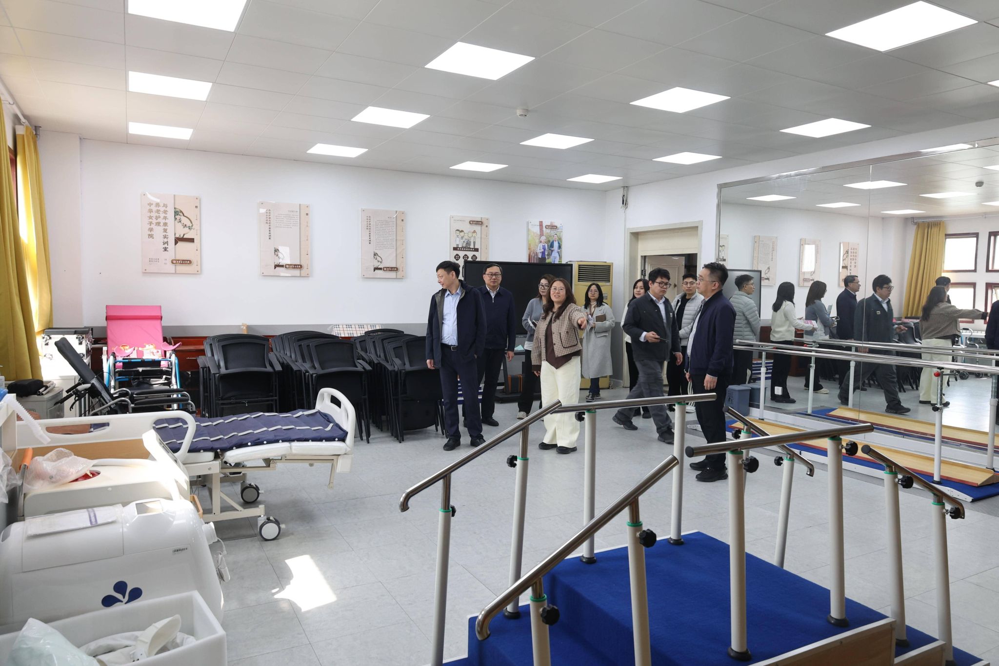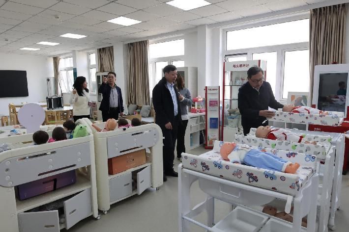 座谈结束后,陈民意一行在学校相关部门负责人的陪同下,实地参观了家庭教育、养老护理与老年康复、中华文化情景教室等相关实训室,详细了解实训室的建设布局、设施设备配置、教学实操开展等情况,对学校将专业教学与实训实践深度融合的做法给予高度评价。