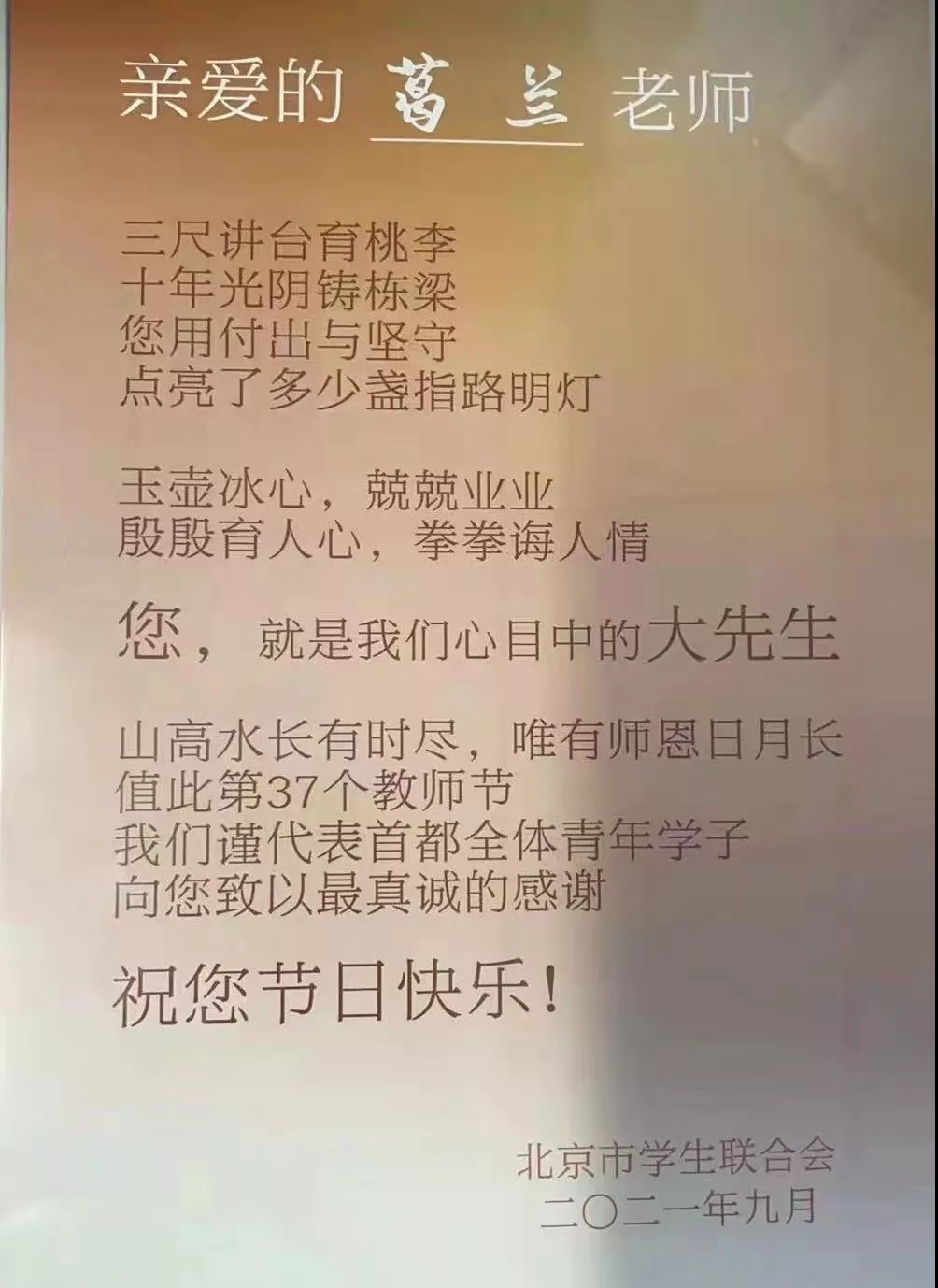 在北京学联组织开展的2021-2022年度感念师恩情,讲述大先生——“我心目中的大先生”主题教育活动中,经由北京高校学生投票,中华女子学院特聘教授葛兰老师获得“我心目中的大先生”称号。
