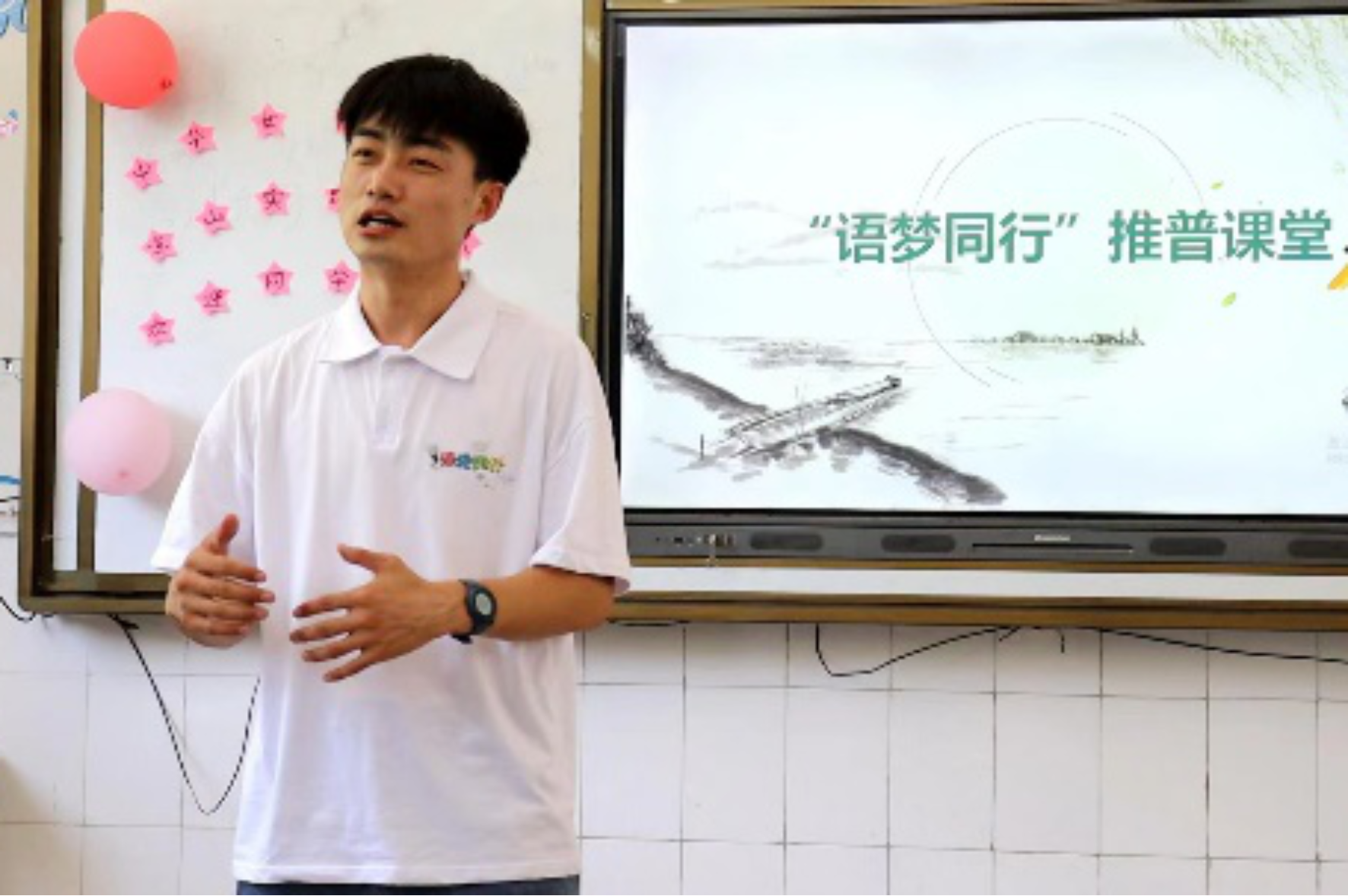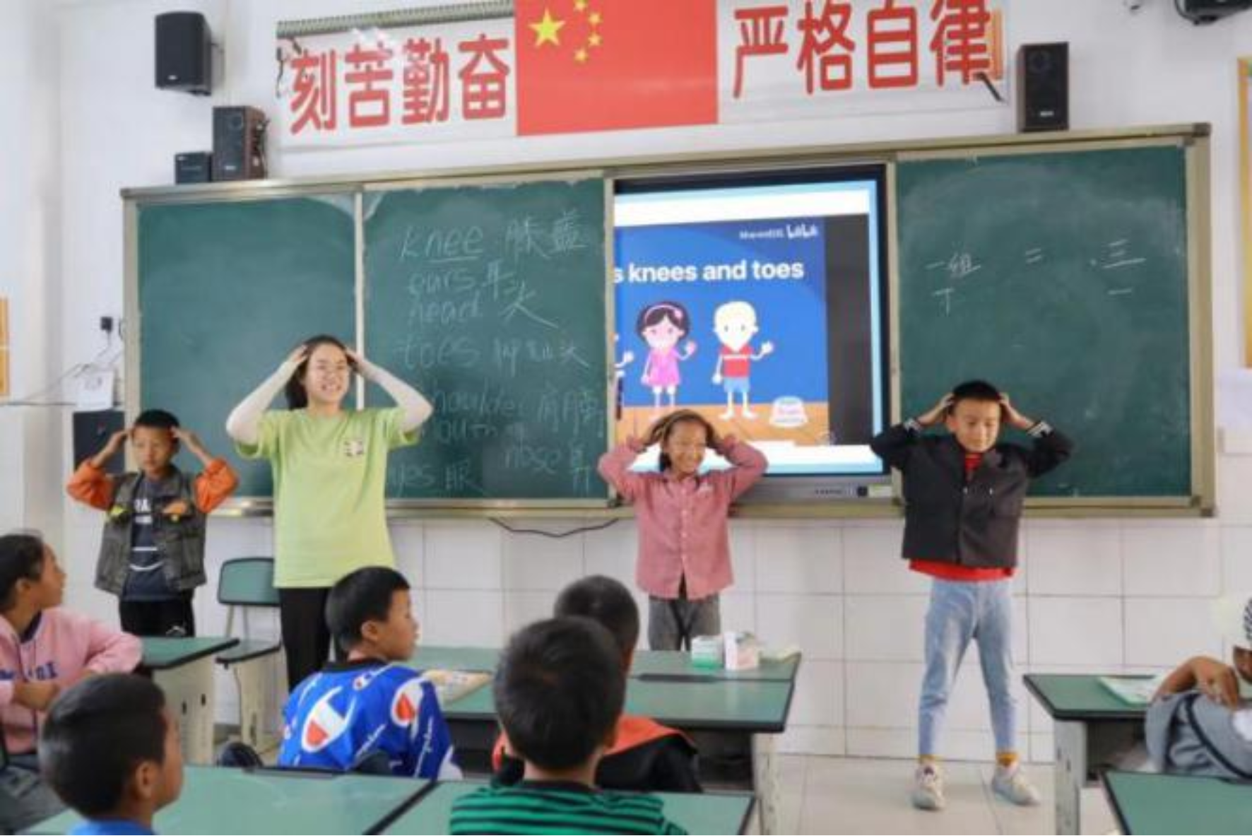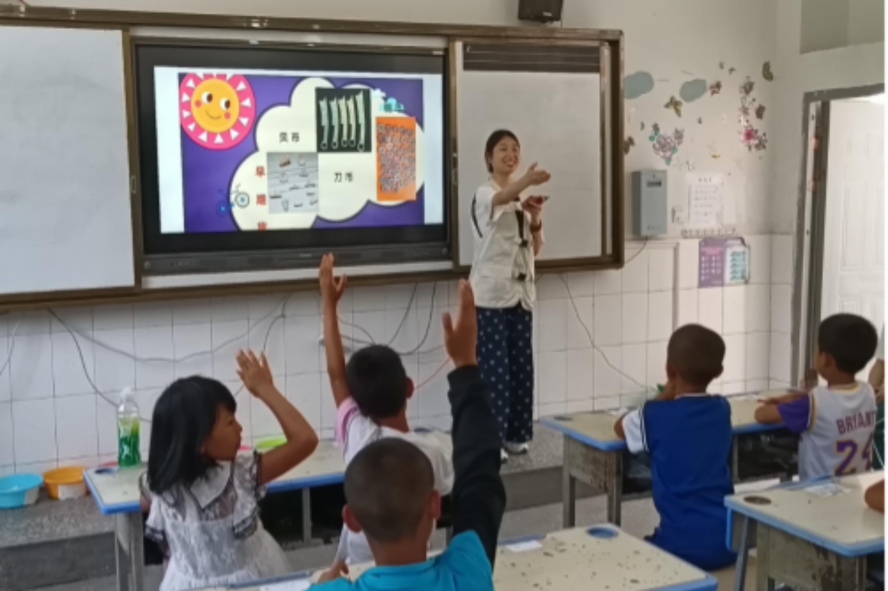 在龙潭镇,普通话课程也走进了不同年级的课堂。在二、三年级的课堂上,实践团成员首先通过“雨点变奏曲”的小游戏让小朋友们迅速地进入学习普通话的状态。之后又通过简单的口部操教学,让孩子们真实地感受唇舌发力,并带领同学们学习有节奏的绕口令与四季有关的古诗词等,进一步帮助孩子们开口朗诵,并且结合手部动作,便于孩子们更好地理解和感受诗歌内容和朗读节奏。
