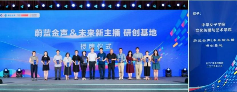 会上,浙江广电集团授予我校文化传播与艺术学院“蔚蓝金声&未来新主播研创基地”称号。我校播音与主持艺术专业2022级本科生祝佳月受邀入驻浙江广电集团人才孵化基地,获颁“Z 视介”青春视介官证书。她表示将以此为新起点,用足用好平台资源,在实践中成长,创作好作品,传递时代新声。