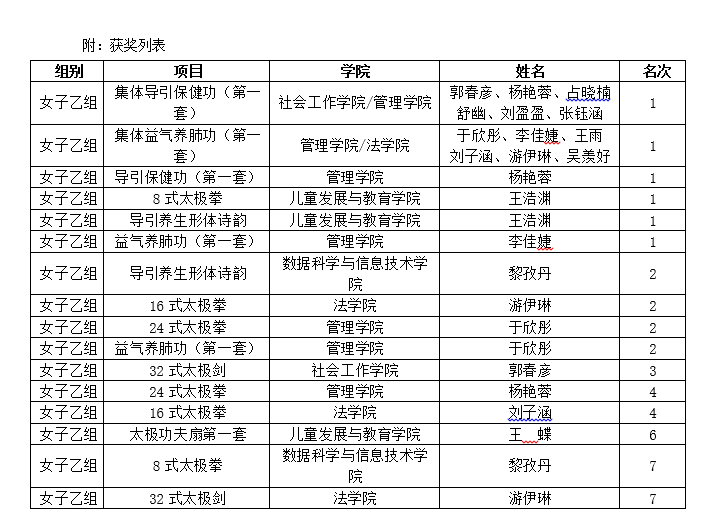 从赛前多月的系统性训练,到赛场上的稳定发挥,武术队队员始终以“自尊、自信、自立、自强”的女院四自精神为指引。集体项目中,队员们凭借行云流水的动作衔接与高度默契的配合,一举夺得乙组导引保健功、益气养肺功双冠军;个人项目里,王浩渊同学表现优异,斩获乙组女子导引养生形体诗韵与8式太极拳两项第一名,杨艳蓉同学则以灵动舒展的动作拿下乙组导引保健功冠军,李佳婕同学在益气养肺功(第一套)中斩获奖牌,展现出女院学子过硬的专业素养与昂扬的精神风貌。