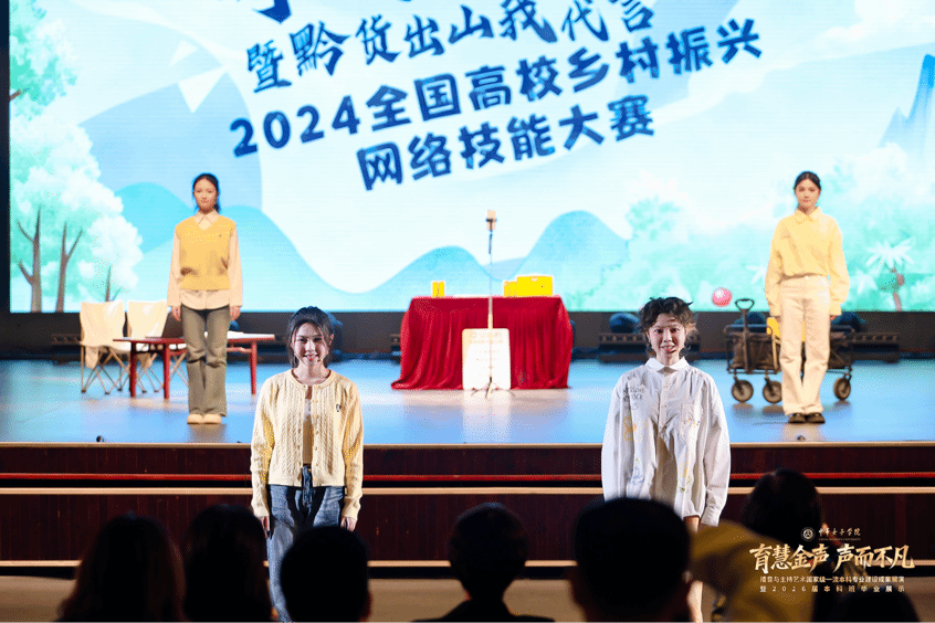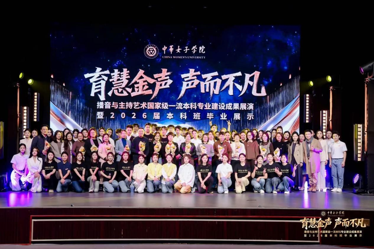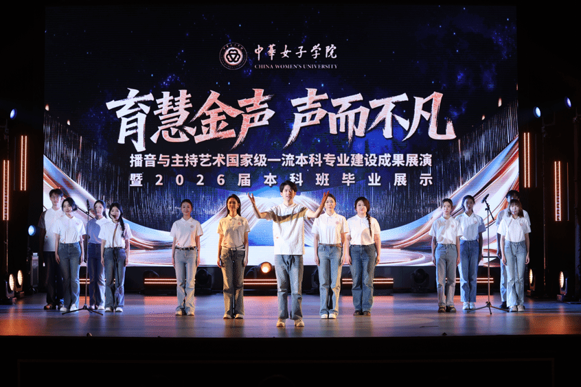 11月18日下午,“育慧金声·声而不凡”播音与主持艺术国家级一流本科专业建设成果展演暨2026届本科班毕业展示在中华女子学院本部礼堂举行。本次展演分为“使命在肩·情起声动”与“硕果盈枝·新声绽放”两个主要篇章,共呈现13个精心打造的节目。