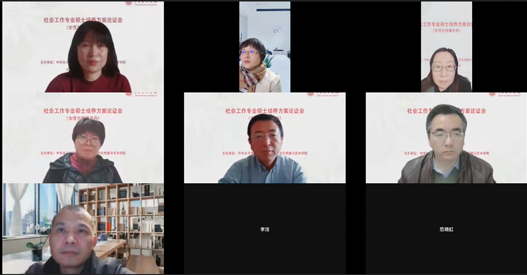 为结合新时期社会工作发展要求,提高我校社会工作专业办学水平,改善专业与课程体系构架,提高人才专业知识素养和技术能力,社会工作学院和文化传播与艺术学院于2022年12月8日下午召开了社会工作专业硕士女性与传播方向培养方案论证会。出席此次论证会的专家有复旦大学社会工作学系顾东辉教授、南京理工大学社会学系张曙教授、山东大学社会工作系程胜利教授、东华大学刘晨澍教授、中国妇女编辑部柳亚敏主任。中华女子学院教务部丁占罡部长、社会工作学院院长李敏教授、文化传播与艺术学院院长王露教授、社会工作学院研究生教研室主任李洁教授以及社会工作学院和文化传播与艺术学院部分教师参加了会议。会议由中华女子学院副院长王练教授致辞,社会工作学院院长李敏教授主持。