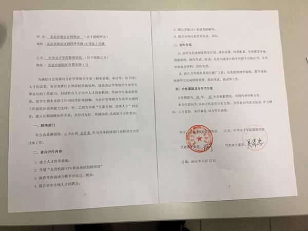 北京注册会计师协会与中华女子学院管理学院双方本着“互惠互利、培养人才”的宗旨,建立长期战略伙伴关系。中华女子学院管理学院与北京注册会计师协会签署了合作培养人才的框架协议。双方将在建立人才培养基地、开展“走进校园-CPA职业基础技能培训”、推荐考核成绩合格学员实习与就业;联合举办专场人才招聘会、联合开展CPA考试考前辅导、联合举办行业学术会议与论坛等方面展开深入合作。涉及培训项目将由北京注册会计师协会负责制定教学计划、课程设置、师资配备;负责教学实施、班级管理、组织考试、面试;负责为成绩合格学员授予合格证书;负责审核宣传资料、宣传方式。