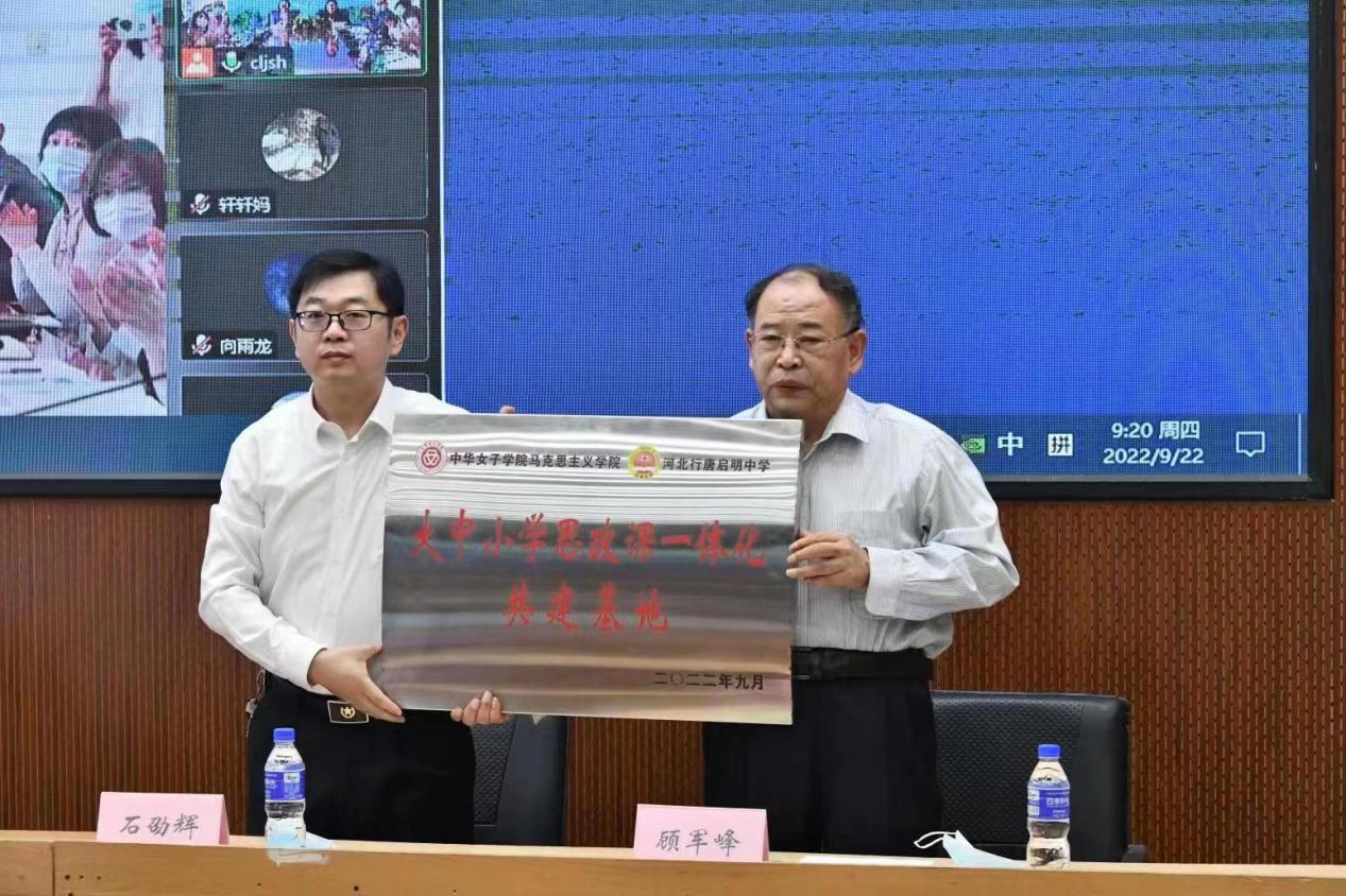 2022年9月22日,中华女子学院马克思主义学院举行了“大中小学思政课一体化共建基地”签约授牌仪式。中华女子学院马克思主义学院走进河北,在河北行唐启明中学设立“大中小学思政课一体化共建基地”,是中华女子学院助力京津冀地区教育协同发展的重要举措,也是中华女子学院思政课教育教学创新的一个重要标志性成果。双方将聚焦“立德树人”根本任务,在教学工作、科学研究、师资培养、社会实践等方面形成长期稳定的合作关系,增加专业规划、心理辅导、普法宣传、信息科技、普通话培训等特色内容,共同推进思政课发展与创新。