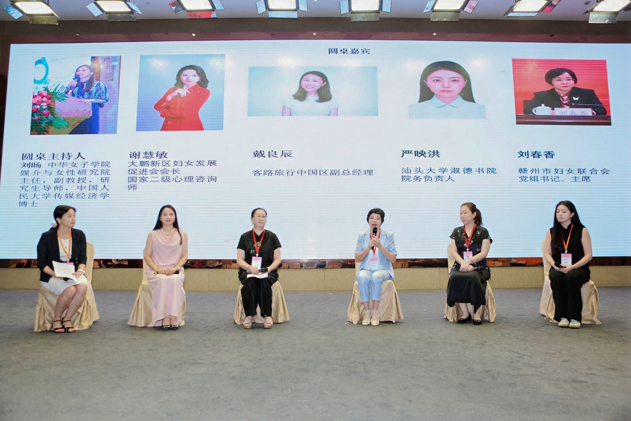 在圆桌论坛环节,赣州市妇女联合会党组书记、主席刘春香、赣州市工商联二级调研员熊梅乐、大鹏新区妇女发展促进会会长谢慧敏、客路旅行中国区副总经理戴良辰、汕头大学淑德书院严映洪五位嘉宾分别分享了自己对AI时代女性创业、就业与职业发展中的所做所思所想。