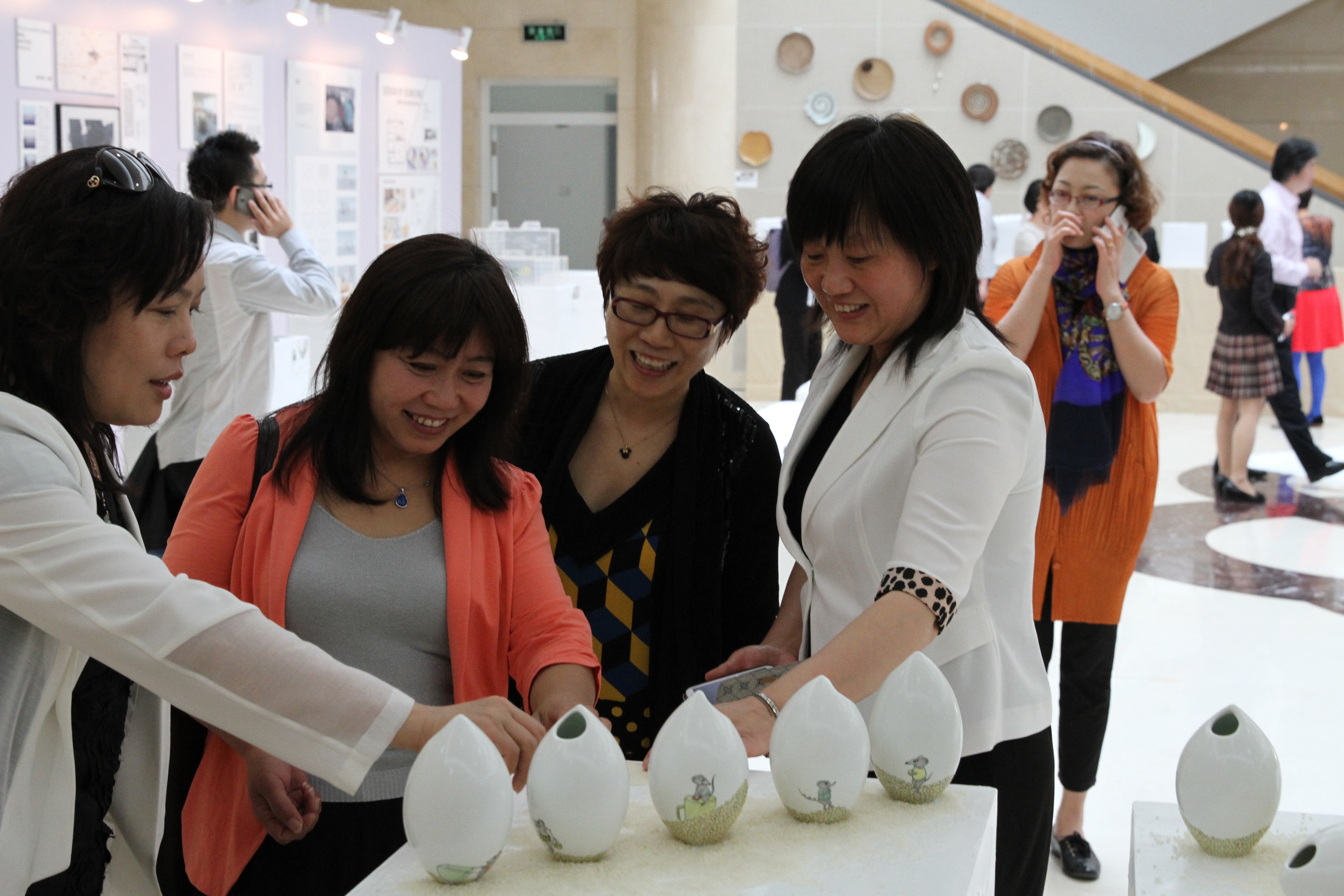签约仪式结束后,六所小学校长和老师到中华女子学院参观了2014届艺术学院毕业设计优秀作品展,并针对作品进行了充分的探讨和了解,进一步对我校的艺术专业有了具体的认识。最后在中华女子学院学生创业基地水语咖啡对合作事宜进行了再次深入的探讨和交流。