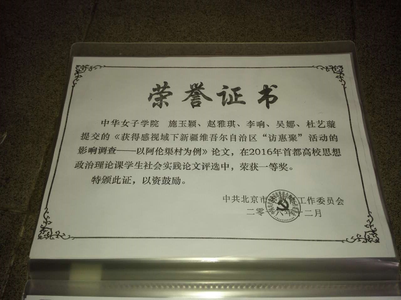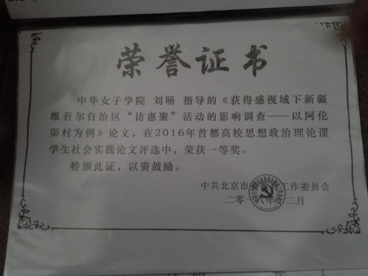 中华女子学院刘旸老师指导的《获得感视阈下新疆维吾尔自治区“访惠聚”活动的影响调查--以阿伦渠村为例》论文,在2016年首都高校思想政治理论课学生社会实践论文评选活动中,荣获一等奖。 中...
