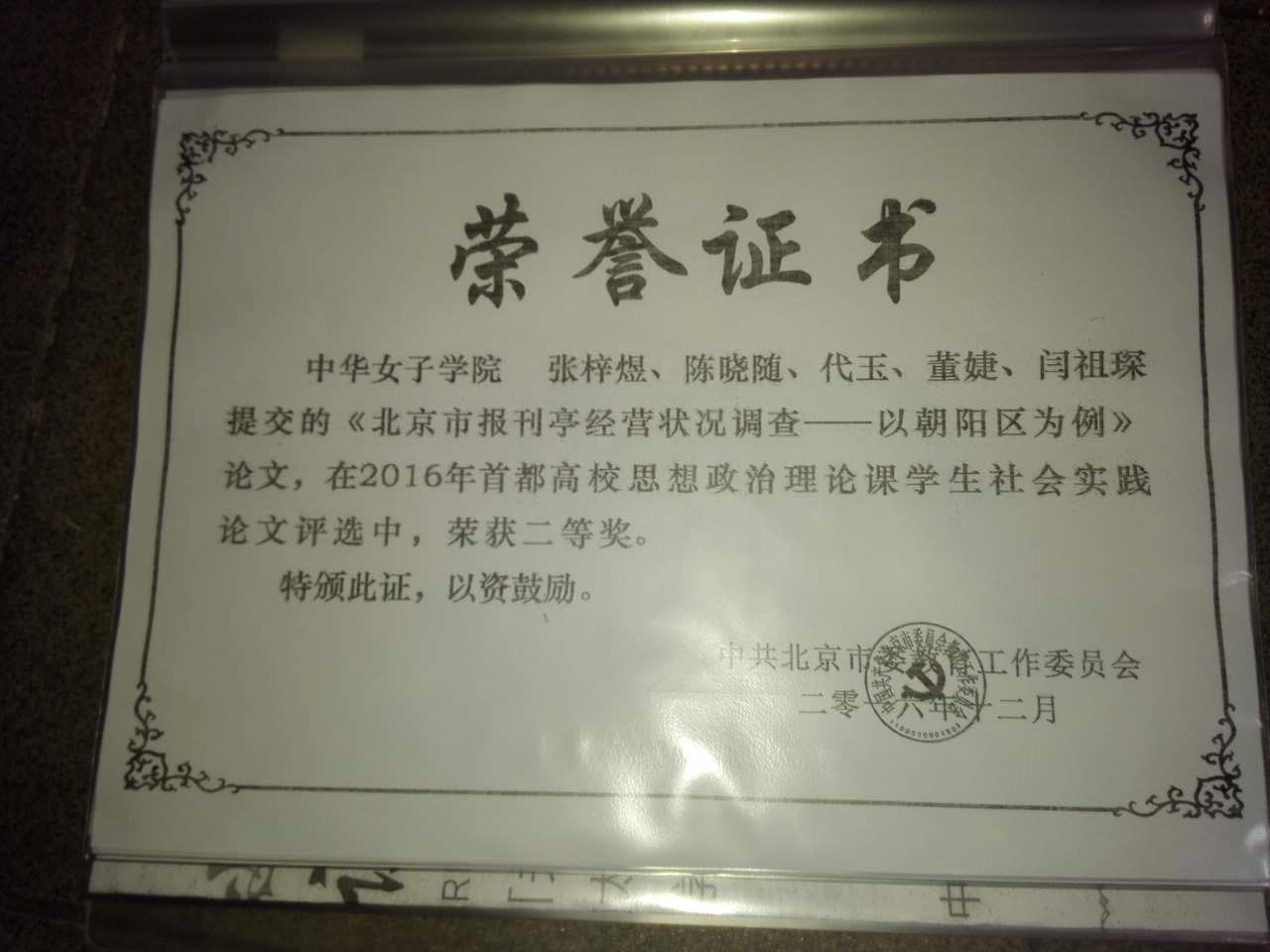 我校学生在2016年首都高校思想政治理论课学生社会实践论文评选中,荣获二等奖