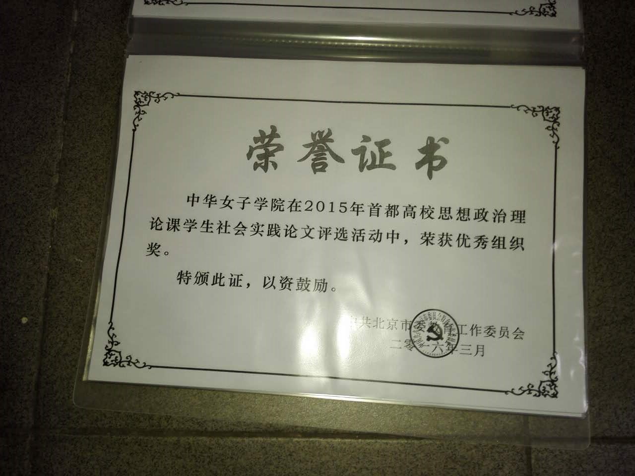 中华女子学院在2015年首都高校思想政治理论课学生社 会实践论文评选活动中,荣获优秀组织奖。