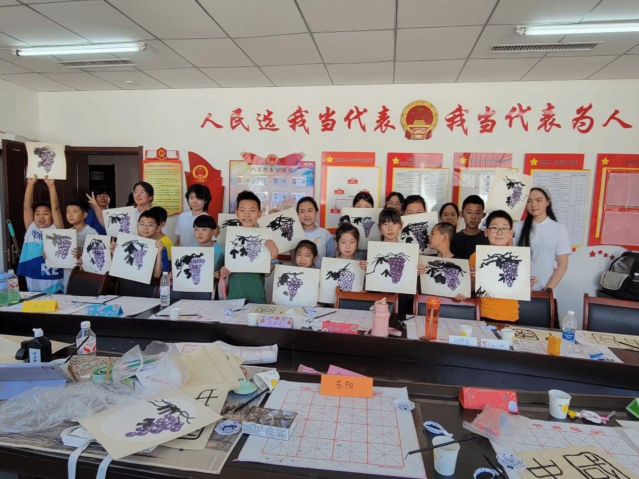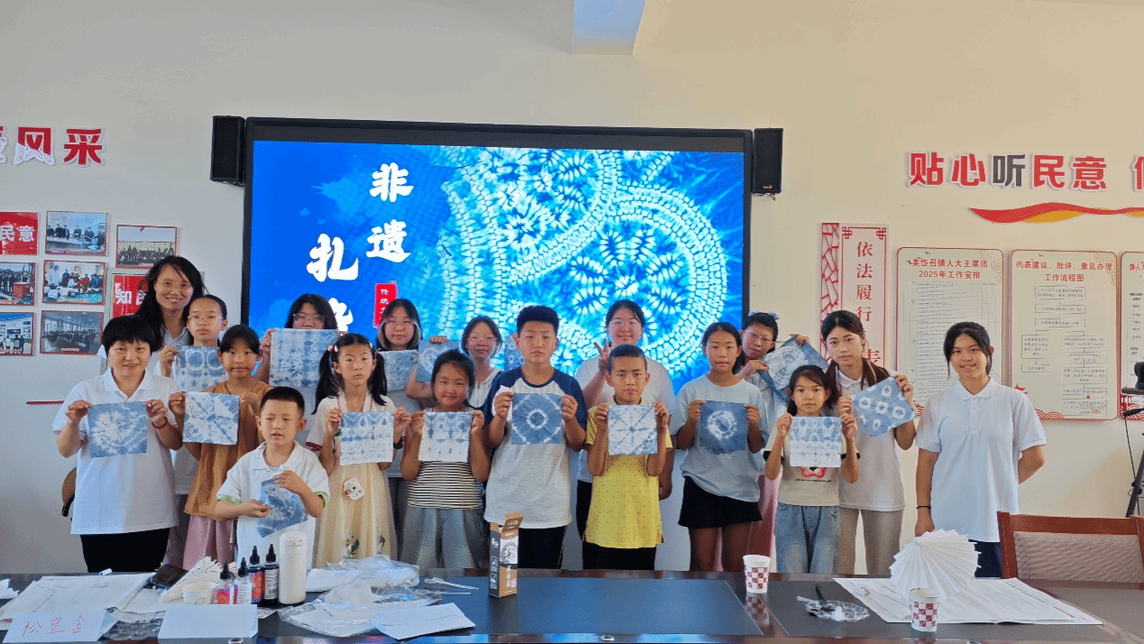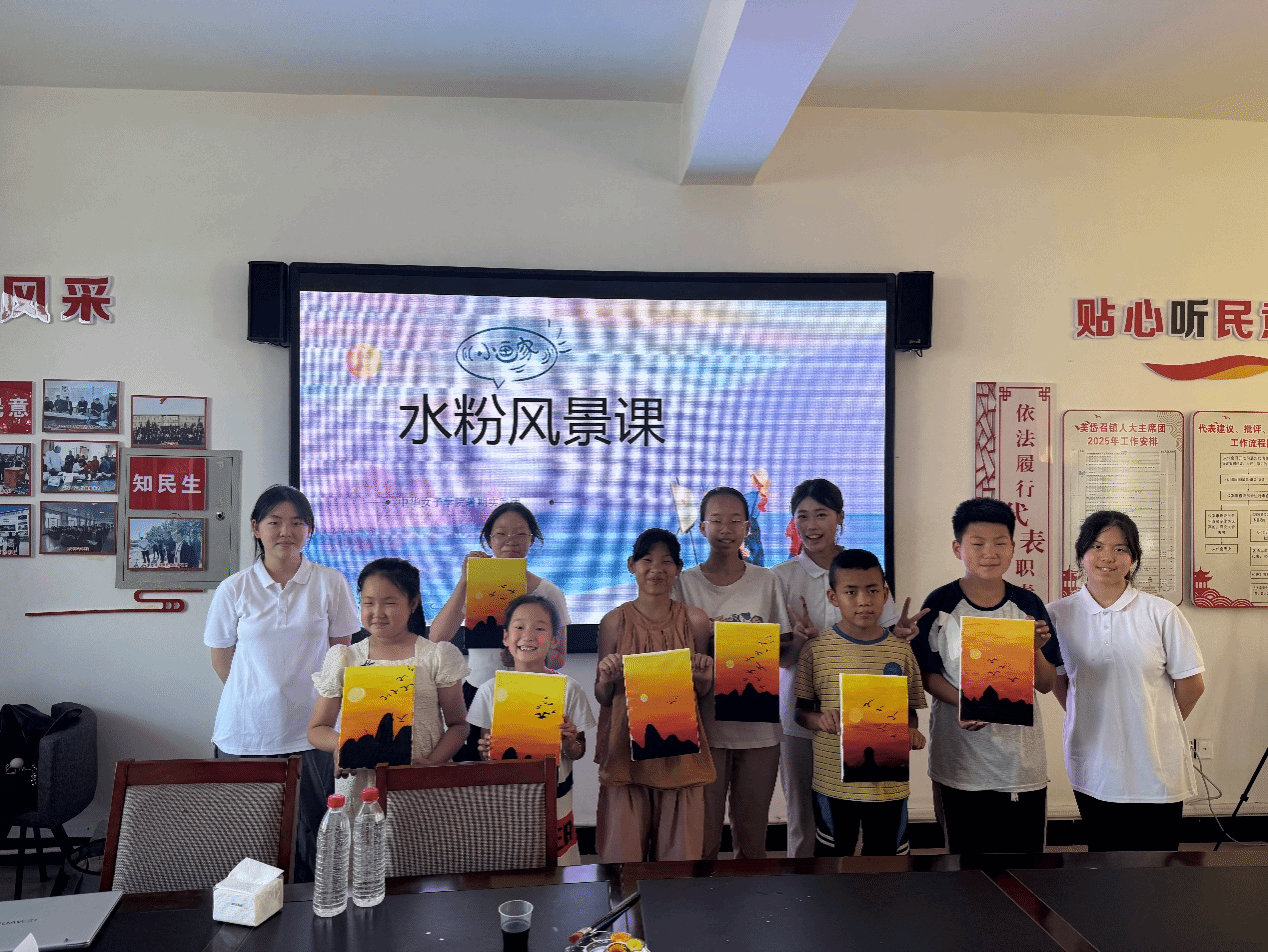 扎染工坊里,孩子们用皮筋捆扎棉布,浸入靛蓝染缸展开"魔法变装";水粉画课上,孩子们亲手调和明黄翠绿,绘制夕阳美景。颜料与布帛交织间,乡村美育新芽悄然萌发。