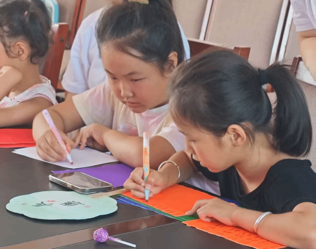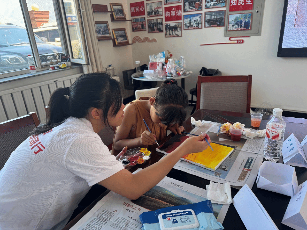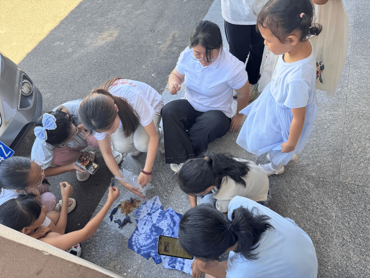扎染工坊里,孩子们用皮筋捆扎棉布,浸入靛蓝染缸展开"魔法变装";水粉画课上,孩子们亲手调和明黄翠绿,绘制夕阳美景。颜料与布帛交织间,乡村美育新芽悄然萌发。