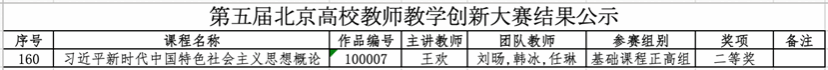 近日,北京市教育委员会公示了第五届北京高校教师教学创新大赛获奖名单。经过网络评审、现场评审两个阶段,马院王欢教授带领的教师团队以基础课程正高组全市第三名的优异成绩获得二等奖,取得了我校在该项赛事中的历史最佳成绩。