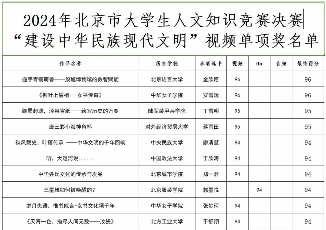 2024年北京市大学生人文知识竞赛以“建设中华民族现代文明”为主题,采取个人赛和团队赛赛制,决赛分现场闭卷考试和创意文案提交两个环节,均为必须参加环节。我校选拔赛由教务部主办,马克思主义学院承办,来自各学院不同专业近300名同学踊跃报名,经过激烈角逐,最终有43名同学获得学校一、二、三等奖,并代表学校参与北京市大学生人文知识竞赛决赛。