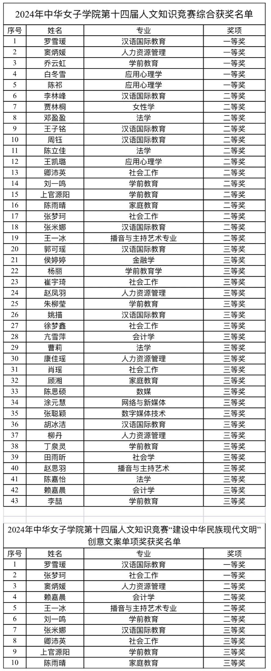 2024年中华女子学院第十四届人文知识竞赛获奖名单: