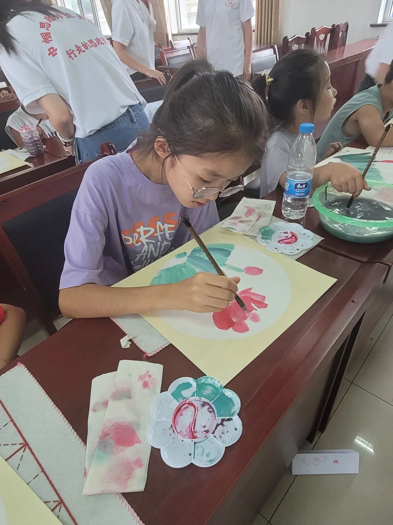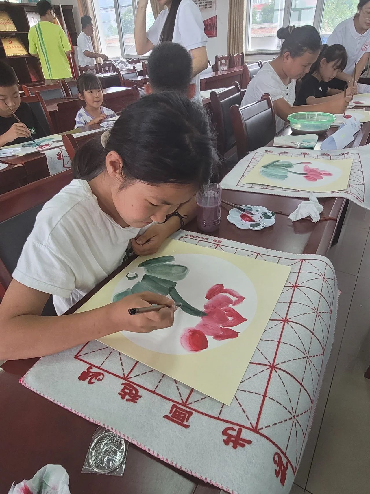 国画课堂上,孩子们通过色彩的绚丽和水墨的奇妙,领略中华传统艺术的魅力,进一步提升审美能力和民族自豪感,同时也增强了他们的团队协作能力和集体意识。
