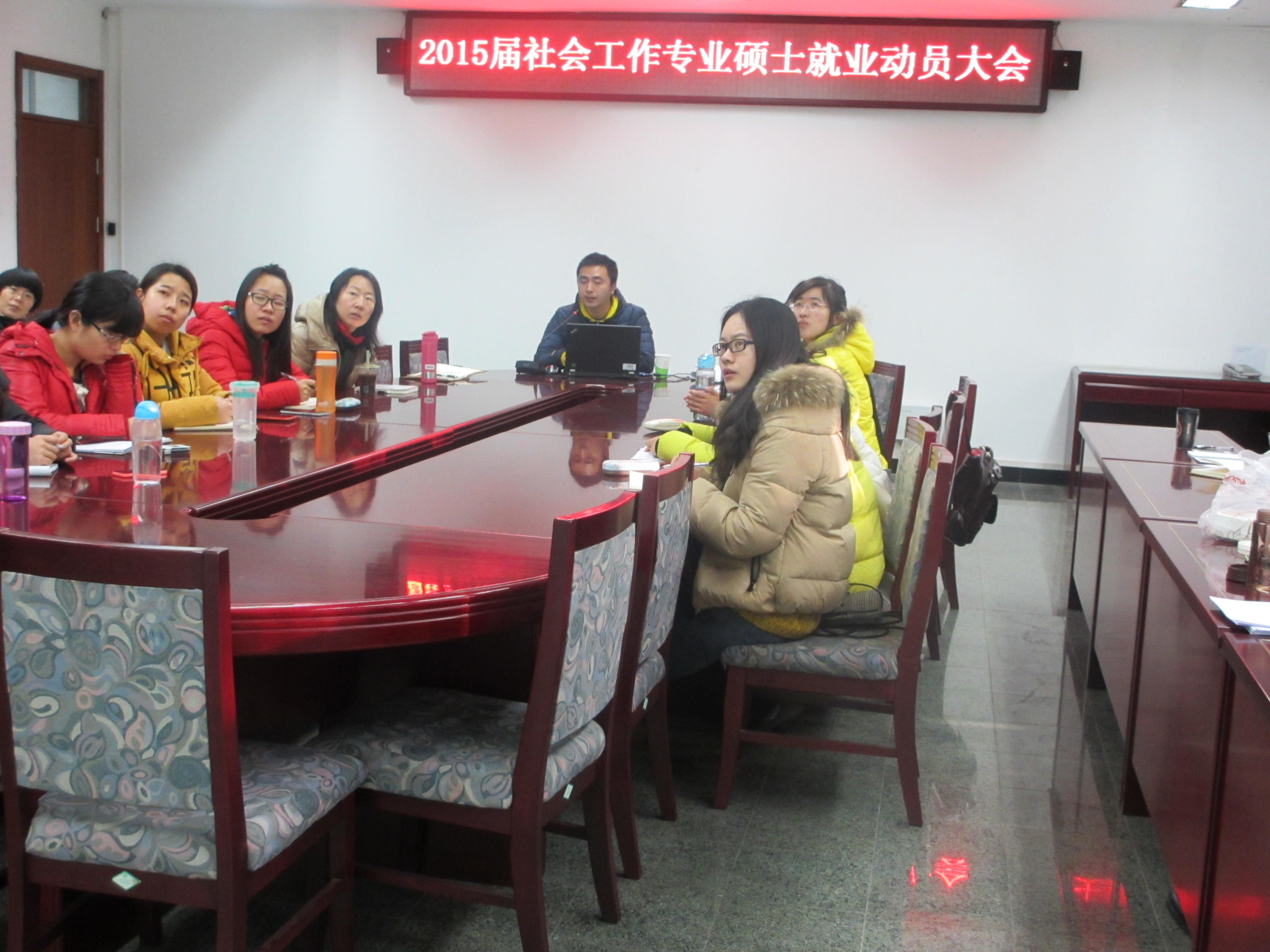 2015116上午,2015届社会工作专业硕士就业动员大会在主楼第七会议室顺利召开。研究生处处长矫杨主持会议,副处长陈岚,专业负责人李敏,就业指导中心张思明、法学院专硕教学秘书张艳娇、研究生处李依濛等老师以及2015届社会工作专业硕士研究生出席了本次会议。